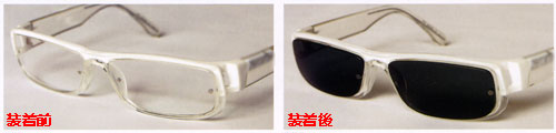 フレーム本体のレンズと着脱用のレンズにそれぞれ小さなマグネットを埋め込み装着する新発想の前掛けサングラスです。