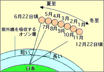 紫外線は、地表に届くまでにオゾン層で吸収されるので、太陽が地球から最も遠くなる冬至は、